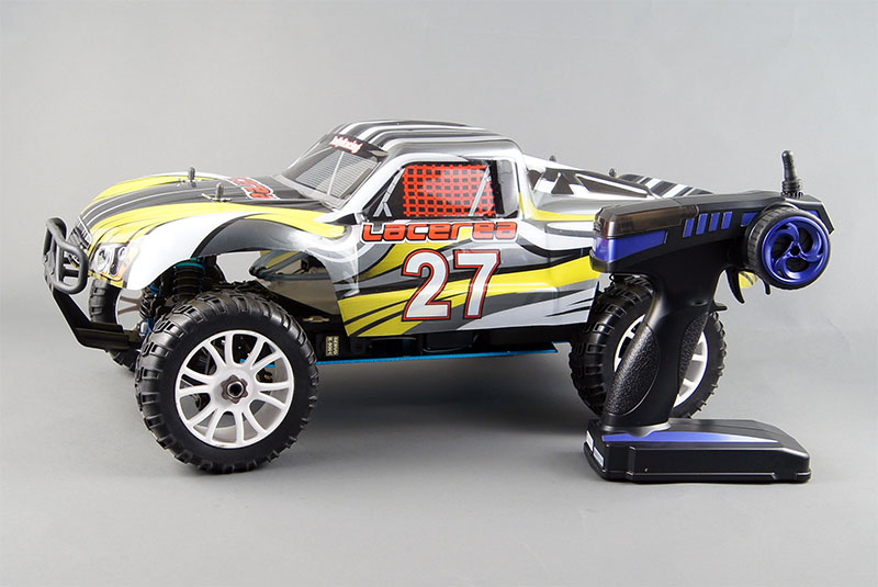 HSP 94863 Gasoline Rally (Lacerea), 1/8 - полноприводная, радиоуправляемая модель раллийного автомобиля на ДВС выполненного в масштабе 1/8. Модель оснащена двигателем внутреннего сгорания SH-18 (2,5см3) работающим на специальном топливе - нитрометане. Двигатель приводится в движение ручным стартером. Управление моделью осуществляется аппаратурой радиоуправления с частотой 2,4 Ghz. Данное шасси предназначено для езды по сложным, ухабистым дорогам с различным покрытием, таким как: гравий, грунт, песок. Она с легкостью преодолевает любые препятствия, прочность конструкции позволяет выполнять прыжки с любых трамплинов и кочек. Независимая подвеска, полный привод и масляные амортизаторы способствуют невероятной проходимости даже на самых сложных участках дороги. Лёгкость в управления, надёжная защита от повреждений делают его доступным не только профессионалам, но и новичкам автомоделирования. Все пластиковые детали подвески имеют аналог из алюминия.